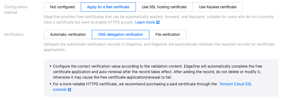 - Beyond the original automatic application mode, the free certificate service now supports DNS delegation verification and file-based verification. This flexibility caters to various user scenarios, including applying for wildcard certificates, applying in split-brain DNS configurations, applying when CNAME flattening is enabled, and applying before adding a CNAME record;