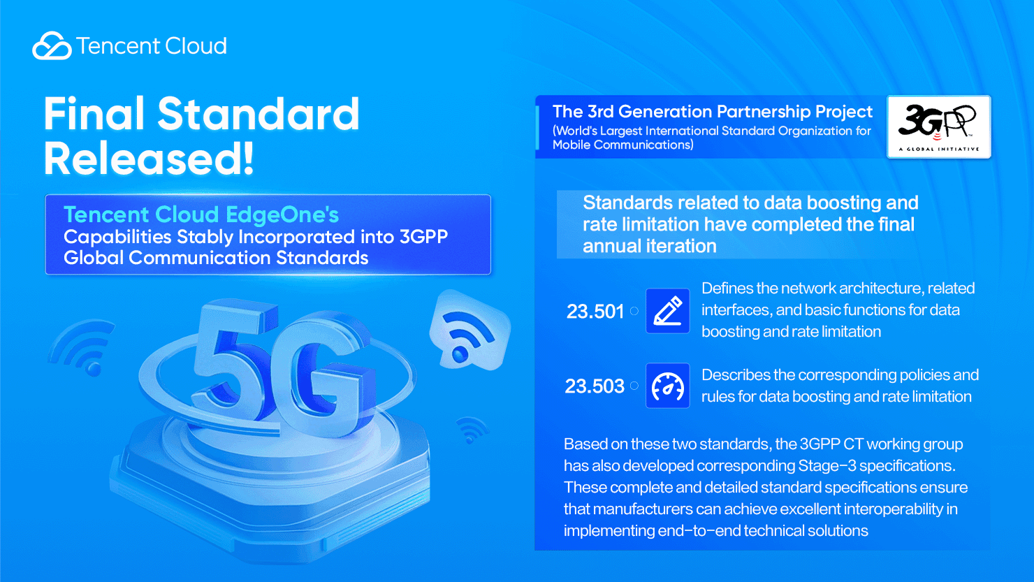 3GPP is the world's largest international standards organization for mobile communications. This meeting was the 4th plenary meeting in 2025, and the meeting released the latest version of 5G core technology specifications such as TS 23.501. In March of this year, EdgeOne's two core capabilities, data boosting and rate limitation, were adopted in international standards for the first time. After three quarters of continuous iterations, this was also the last release of the year, which means this part of the international standard has become stable. This achieved deep integration of CDN and mobile communication networks, significantly improving the user experience of mobile Internet services such as video games, marking Tencent Cloud EdgeOne's leading position in the field of edge security acceleration.