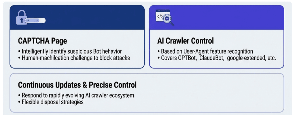 In addition to crawler management, the update includes the CAPTCHA Page feature designed to mitigate automated attacks. This function intelligently identifies suspicious Bot behavior and triggers a human-machine verification CAPTCHA.