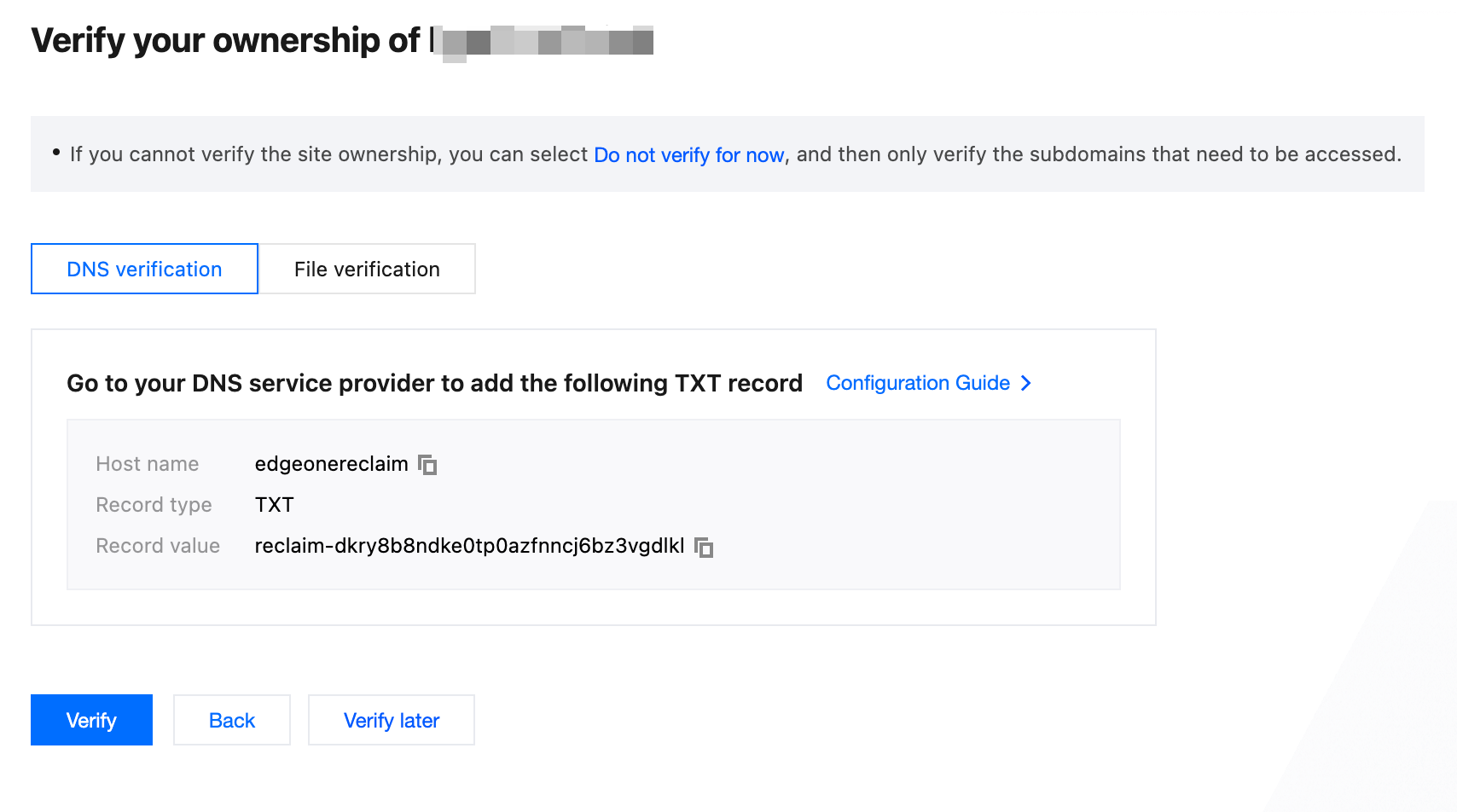 Domain verification: If your company is a multi-level business or provides domain operations and maintenance and you only have permission to configure DNS resolution and the origin server for the subdomain names, you can skip verification when connecting the site. However, all its subdomain names need to be verified before being added.