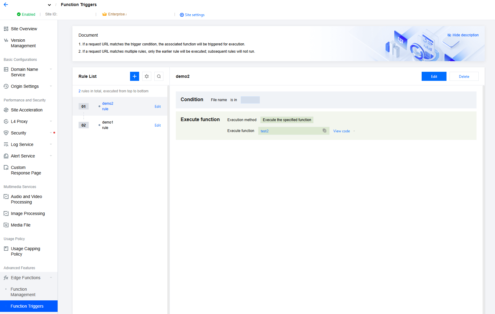 Supports adding, deleting, modifying, and querying function trigger rules under a Site.