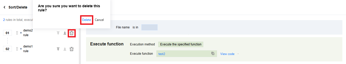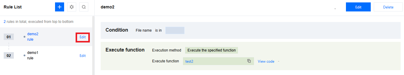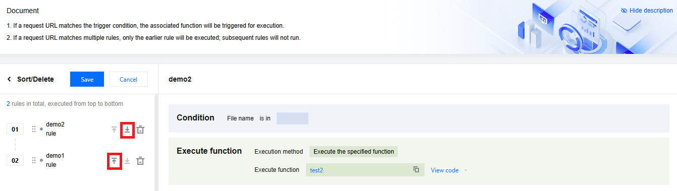 Supports quickly adjusting the priority of trigger rules, which are executed in sequential order by rule number. If a request URL matches multiple rules, only the rule with the smallest sequence number is executed, and subsequent rules are not executed.