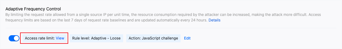 Adaptive frequency control establishes and updates the rate baseline by continuously monitoring and analyzing your website's traffic pattern. The system counts the current domain name's request rate based on the configuration, establishes the rate baseline based on the last 7 days of requests (updated every 24 hours), and limits the request rate of a single client accessing the domain name according to the configured limitation level.