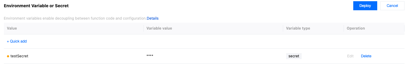 Configuration decoupling: Environment Variables or Secret allow developers to configure edge functions without modifying the function's code, meaning developers can set different variable values for different environments (such as development, testing, and production) to control function behavior.