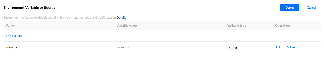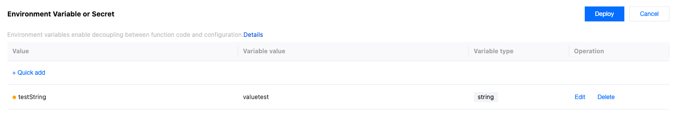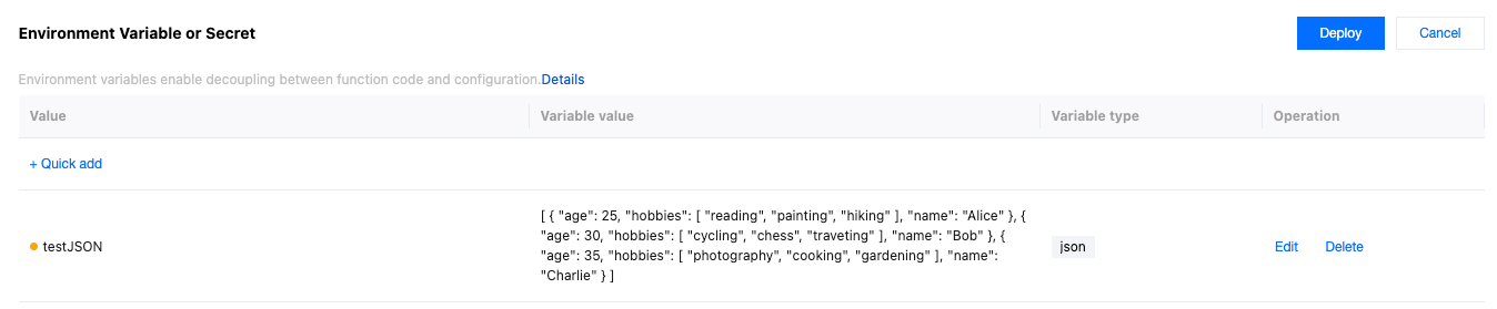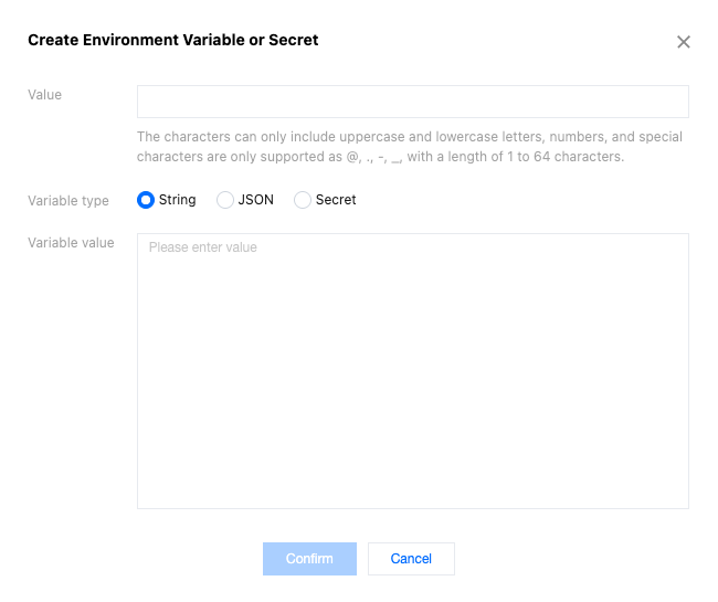 Variable type | Required. It supports String, JSON and Secret types. String: After this option is selected, the input variable value content will be saved as a string. For specific usage, refer to the Edge Functions Referencing Environment Variables or Secret section for the variable type String. JSON: After this option is selected, the input variable value content will be saved as a JSON array. The edge functions will automatically parse the variable value into a JavaScript object without the need to manually call JSON.parse(). For specific usage, refer to the Edge Functions Referencing Environment Variables or Secret section for the variable type JSON. Secret: When this option is selected, the variable can be saved as either a JSON array or a string. Once saved, the variable value will no longer be visible—please keep it secure. For details, see the Edge Functions Referencing Environment Variables or Secret section, under the "Secret" variable type. |