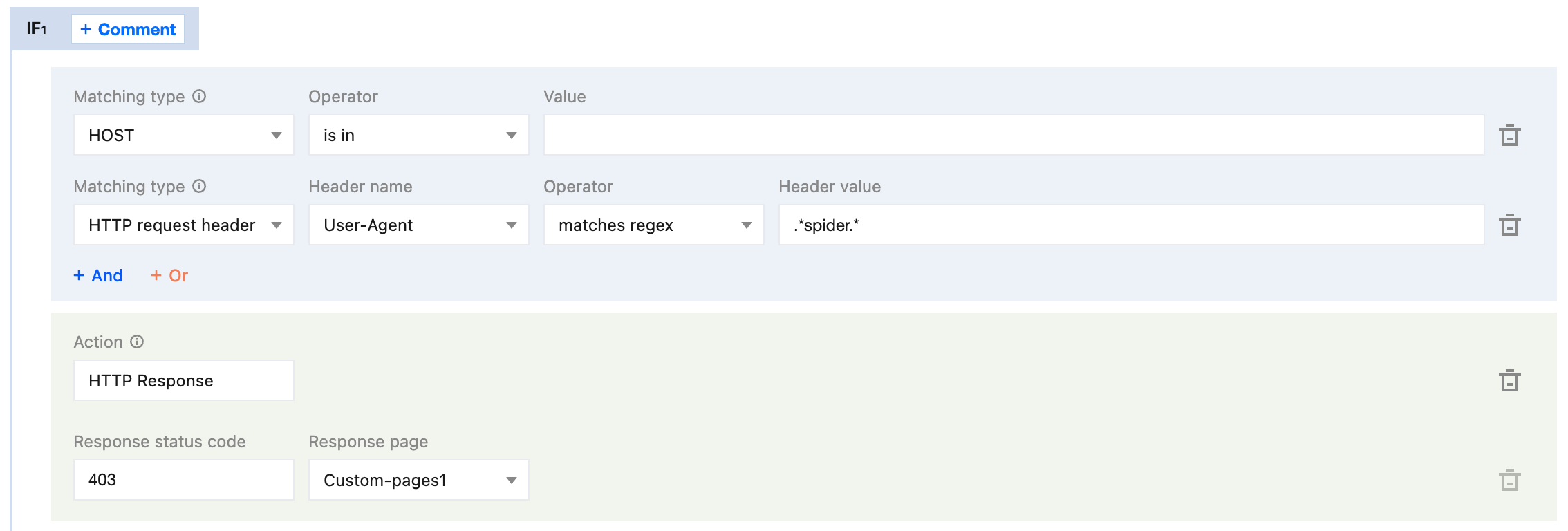 The domain business www.example.com under your example.com site is maliciously crawled by Google crawlers, causing a sudden bandwidth increase and severely impacting fees. Through analysis, it was found that the crawler request's User-Agent contains spider. If you want to block such requests, you can follow these steps: