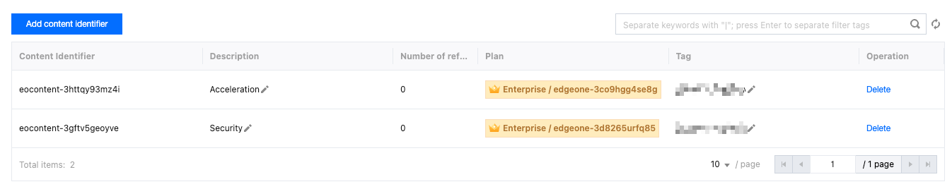 1. Create a content identifier to identify domain names responsible for the acceleration department and security group, and associate tags with the content identifier.