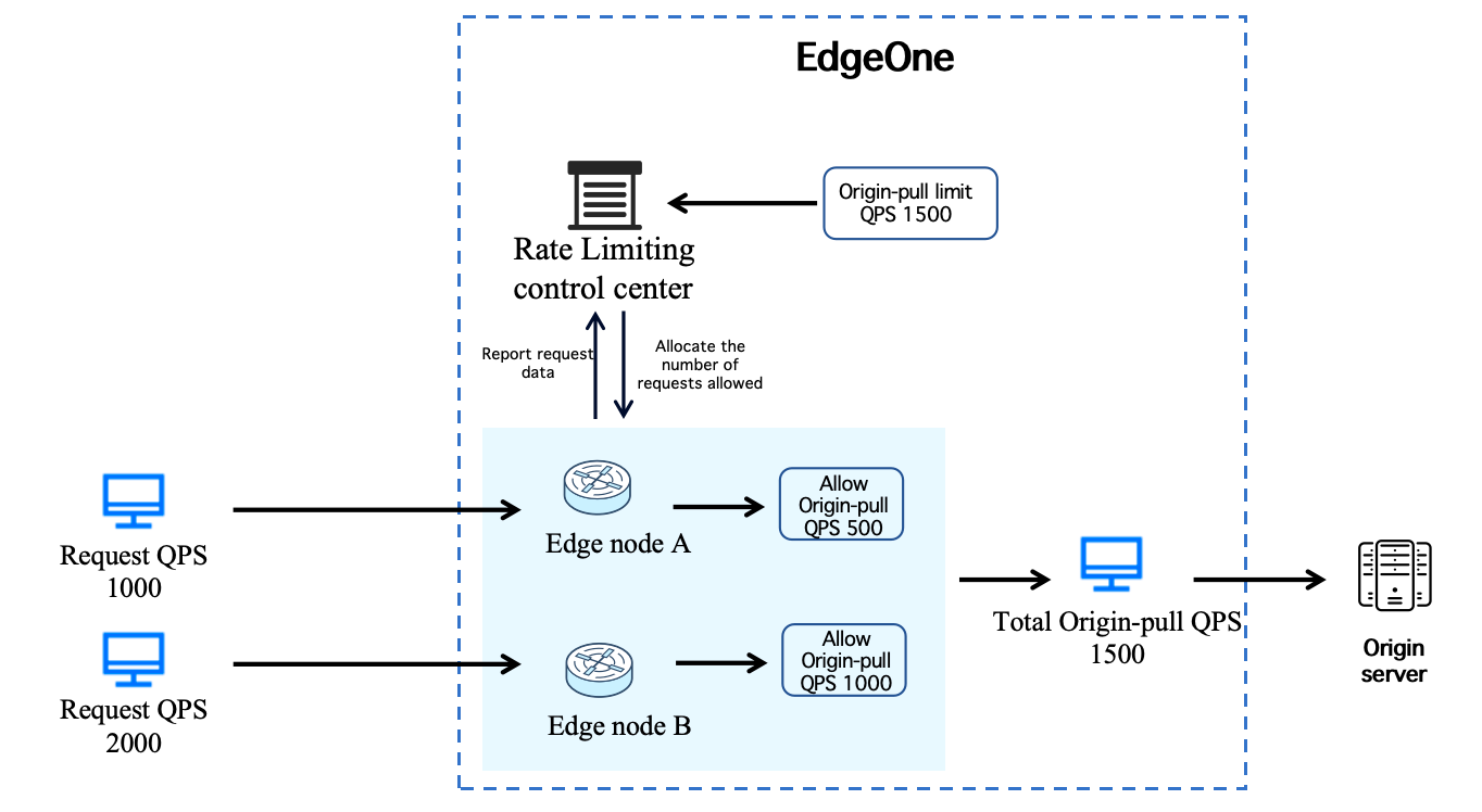 EdgeOne provides users with globally distributed edge node services. Users' requests will return to the origin server through edge nodes in different regions. When requesting origin-pull, EdgeOne periodically collects the origin-pull request volume of all edge nodes, then automatically allocates the allowable origin pull QPS value for each node based on the user-set origin pull rate limit and node count, following a certain percentage. It dynamically adjusts according to changes in edge nodes' request volume to ensure the total origin-pull request volume of all nodes does not exceed the user-defined origin pull rate limit.