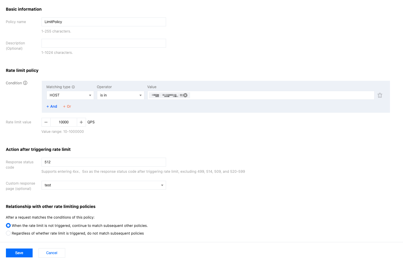 4.Click Save to issue configuration. After deployment, the rate limit policy will take effect. The expected result is: if the number of origin-pull requests for domain api.example.com is no more than 10,000 QPS, the system will respond normally; if exceeded, it will return status code 512.