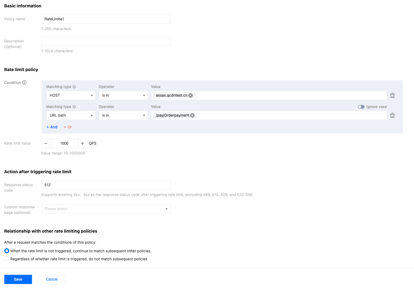 4. Click Save to issue configuration. Then repeat procedure 3 to create policy 2, selecting the match condition as HOST equals api.example.com AND URL path is in /pay/Orderpayment, setting the rate limit value to 500 QPS, and entering 512 in the response status code. See the following configuration: