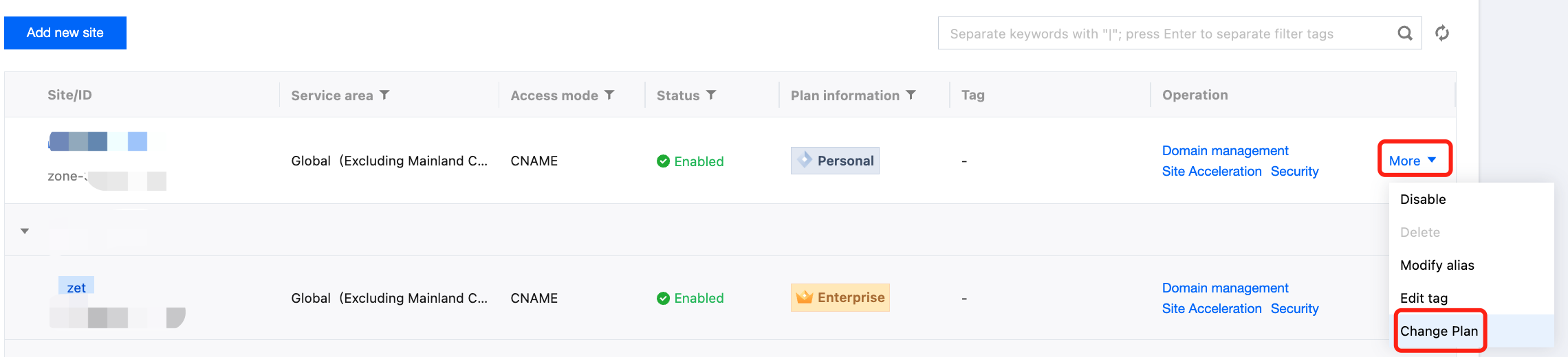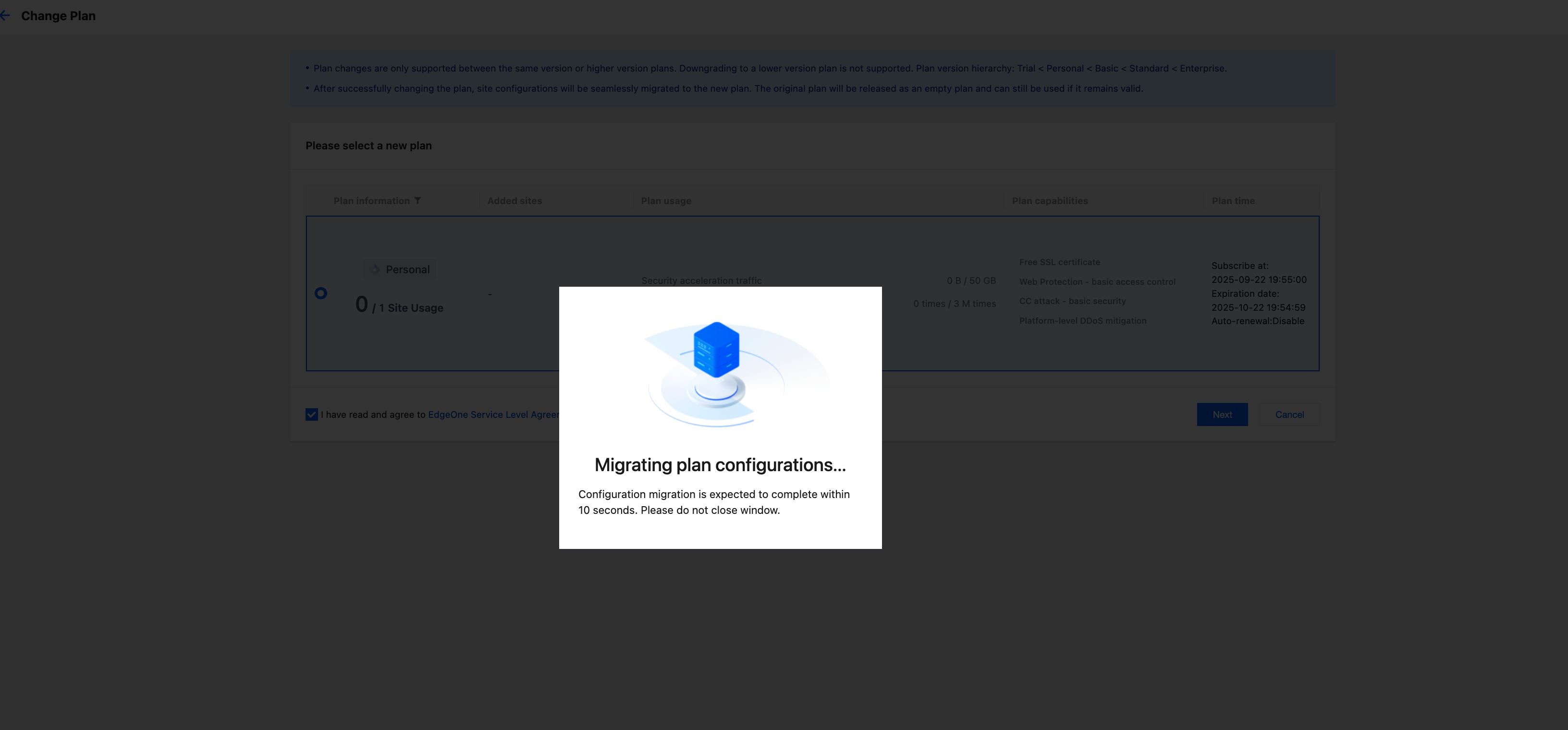 Upon success, the site configuration will seamlessly migrate to the new package. The original package will be released as an empty package. If the original package is still valid, you can continue accessing the site.
