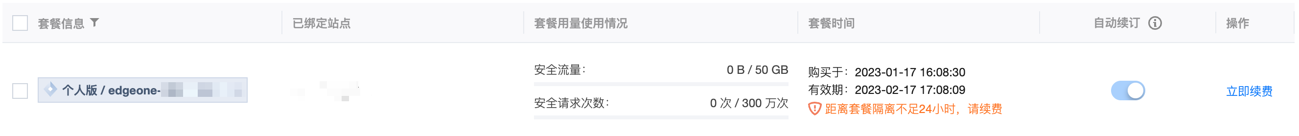 2. 同时 EdgeOne 控制台 > 套餐管理页面 将针对即将到期的套餐进行提示,如下图: