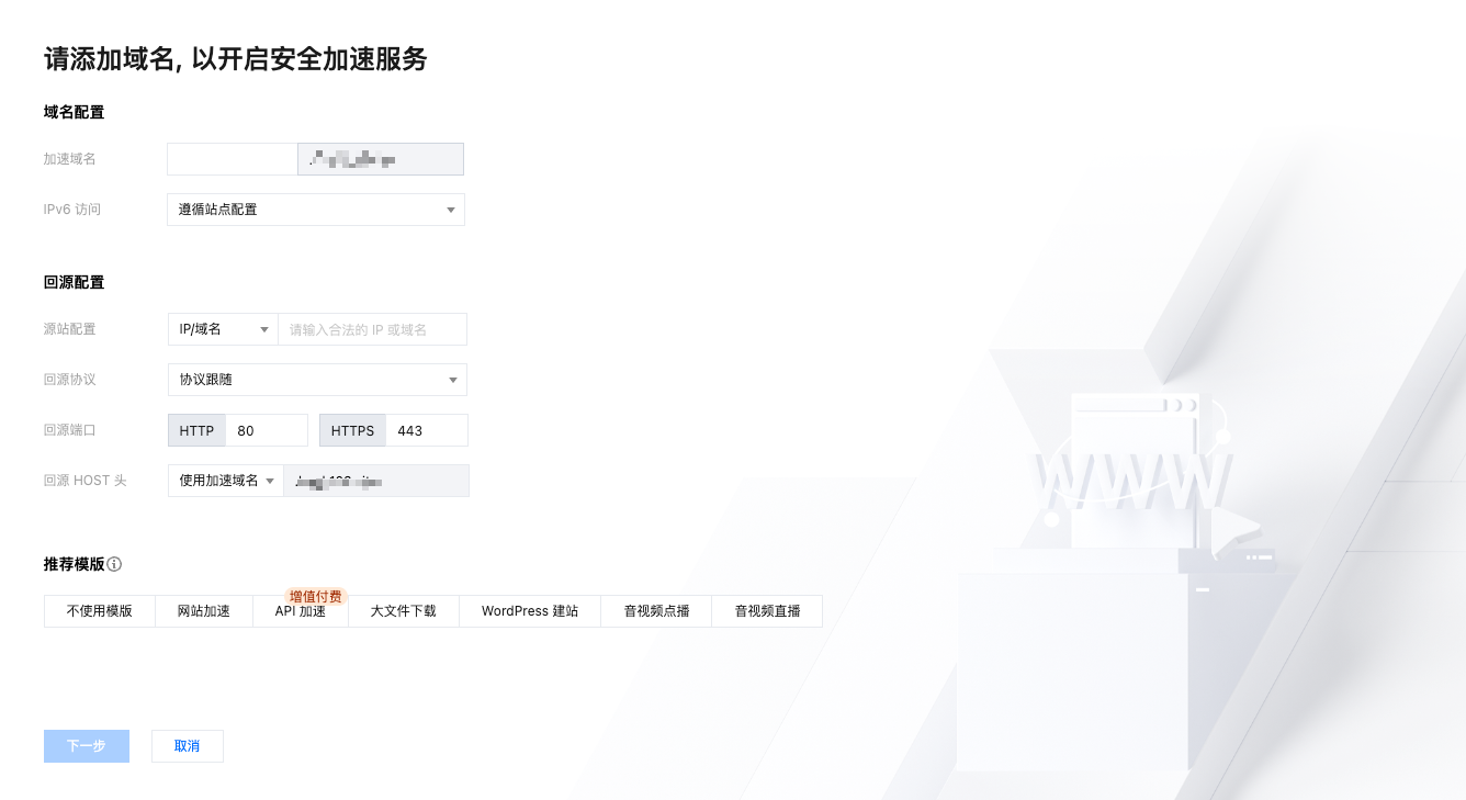 如果您是通过域名接入,该步骤需要选择符合您需求的加速区域和接入模式。