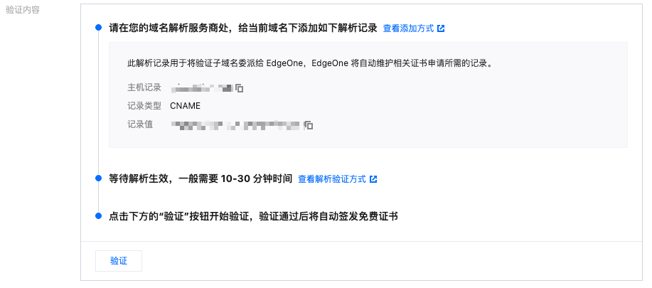 6. 查看需要配置的验证内容,在当前的域名解析服务商内,配置指定的 DNS 记录,将验证域名的记录解析托管给 EdgeOne 指定域名。例如:在当前示例中,域名的解析托管在腾讯云云解析 DNS 内,可参考以下步骤配置,如果域名解析在其它服务商内,请参考对应解析服务商的操作文档配置: