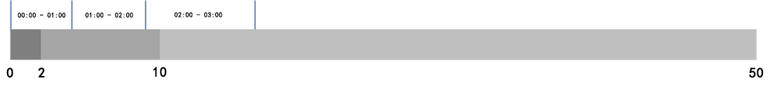若用户 1 月 1 日 23:00 订阅标准版,1 月 1 日 23:00 - 24:00、1 月 2 日 00:00 - 01:00、01:00 - 02:00、02:00 - 03:00 分别在中国大陆地区流量消耗为 3 TB、4 TB、5 TB、6 TB,中国境外各大区未产生消耗。1 月 1 日 23:00 - 24:00 产生的 3 TB 中国大陆地区流量抵扣套餐内含流量,1 月 2 日 00:00 开始产生后付费流量,下图中灰色为实际计费阶梯,流量小时结的后付费采用实际月阶梯累进的方式进行计费,用户产生的流量将累计到不同阶梯,按照不同的阶梯价格计费,用户在 1 月 2 日 00:00 - 03:00 共产生了 15 TB 流量,其中 2 TB 落入 0 TB - 2 TB 的计费阶梯, 8 TB 落入 2 TB - 10 TB 的计费阶梯, 5 TB 落入 10 TB - 50 TB 的计费阶梯,因此,1月2日产生的套餐外超量费用如下: