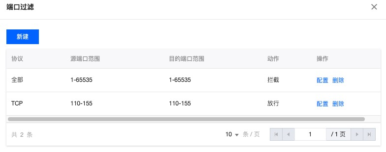 5. 在端口过滤页面中,单击新建,创建端口过滤规则,以当前场景为例,新建两条规则,规则 1 的协议选择为全部协议,源端口范围和目的端口范围均为 1-65535,动作为拦截,规则 2 的协议选择为 TCP 协议,源端口范围和目的端口范围均为 110-155,动作为放行,单击保存。