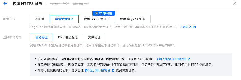 1. 免费证书由 TrustAsia 和 Let's Encrypt 机构颁发,如果您的站点当前为 NS 接入的方式,可申请泛域名证书,如果当前为 CNAME 接入,EdgeOne 只支持申请单域名证书,不支持申请泛域名证书。