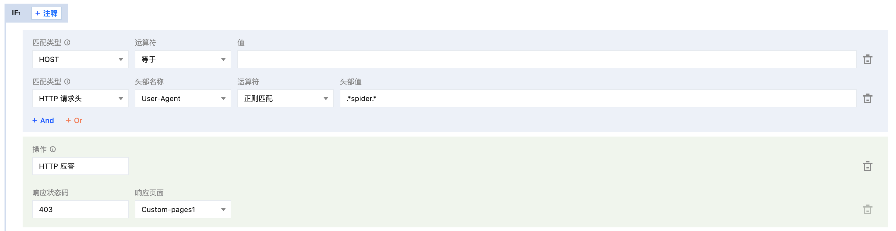 .*spider.*。3.3 配置响应状态码 403,响应页面通过下拉框选择,若当前无页面,则需要单击新建页面先创建,创建完成再引用。