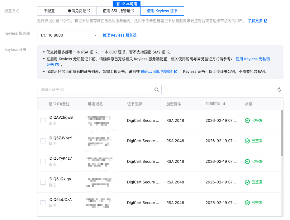 步骤三:在 EdgeOne 控制台内配置域名使用 Keyless 无私钥证书
