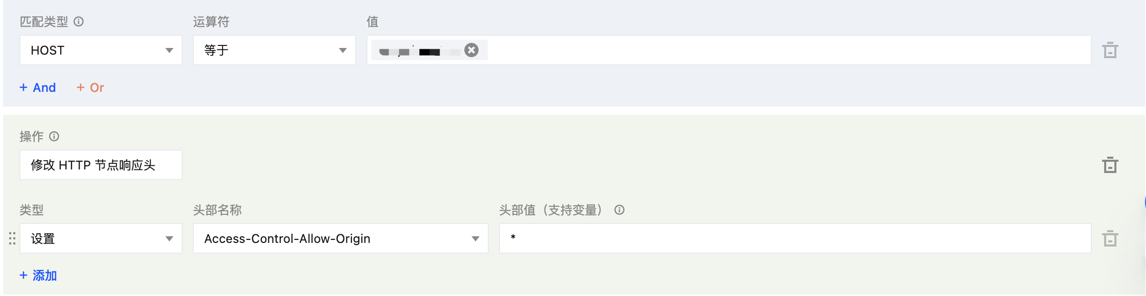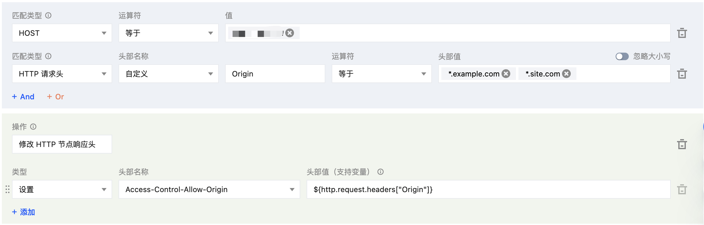 www.example.com,同时设置匹配类型 HTTP 请求头 Origin 头部值等于