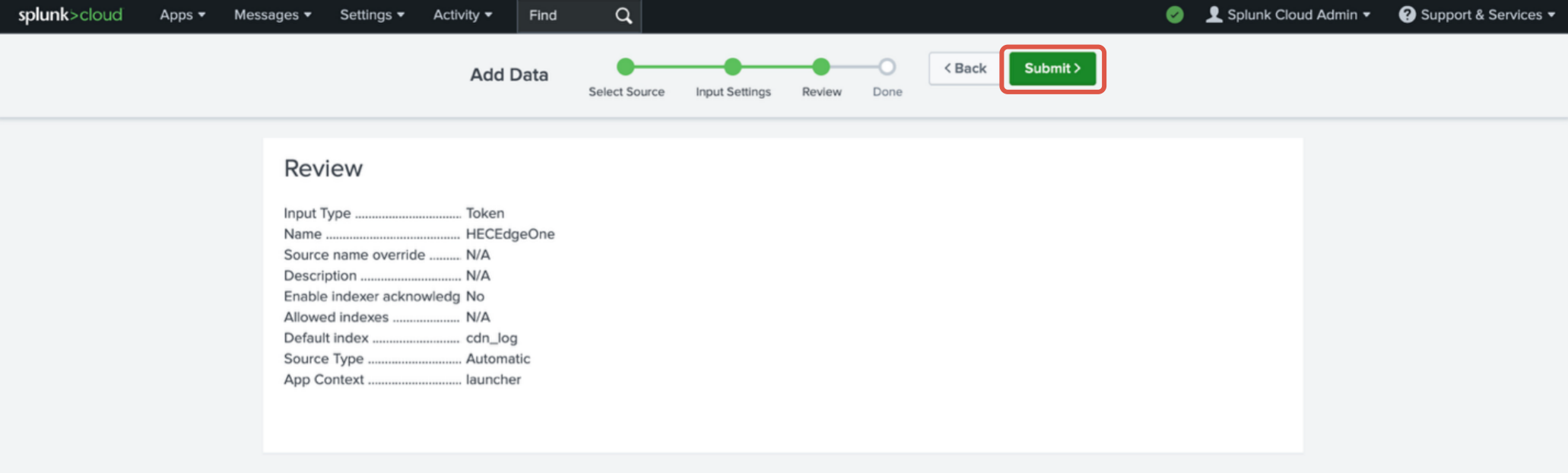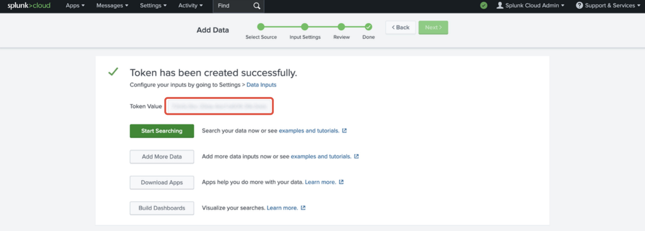 对于 Splunk Enterprise,详情请参见 Set up and use HTTP Event Collector in Splunk Web。