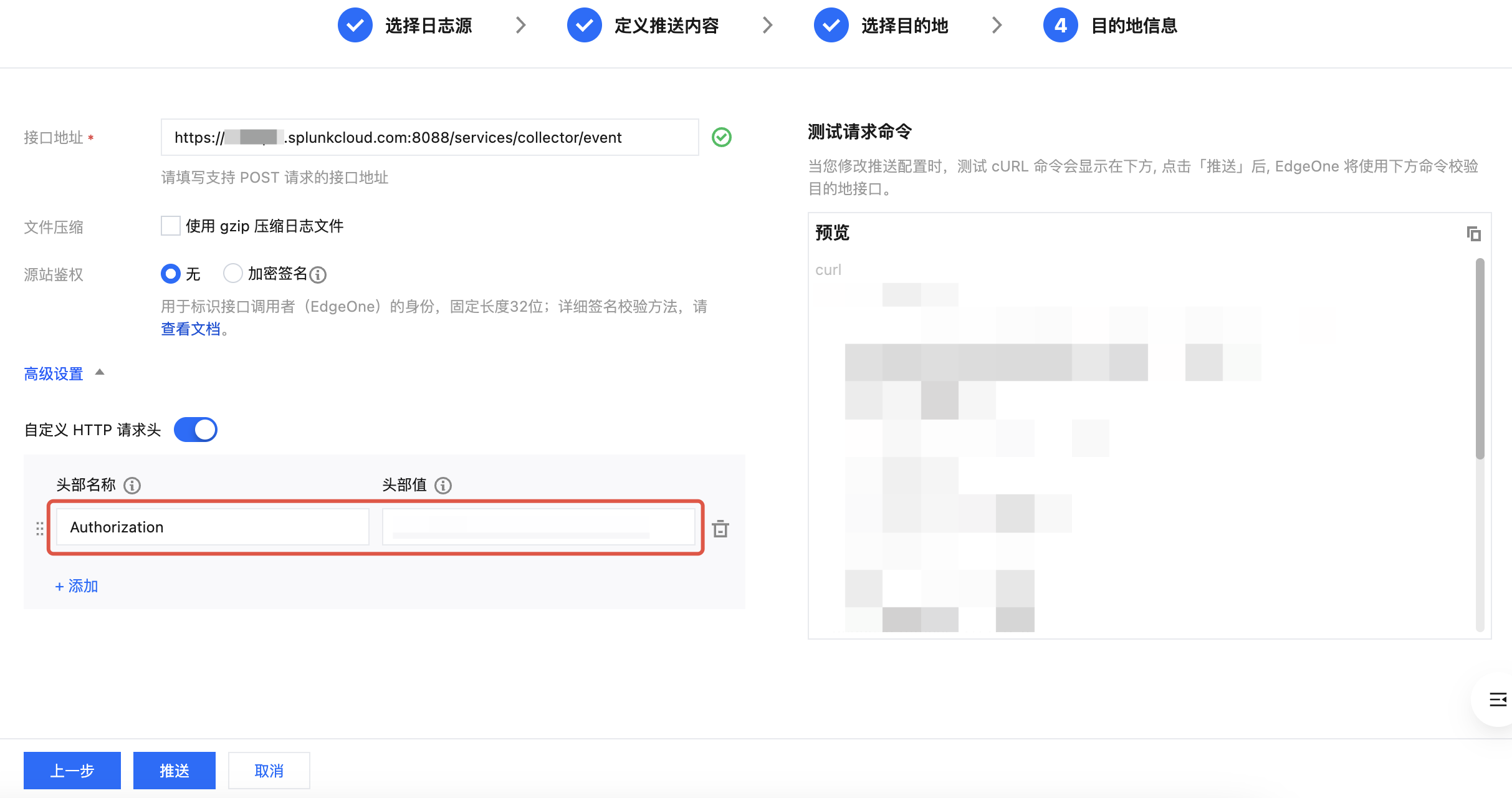 https://example.splunkcloud.com:8088/services/collector/event 为例;内容压缩:为减少日志内容的大小,节约流量开销,您可以通过勾选使用 gzip 压缩日志文件开启内容压缩,EdgeOne 将会使用 gzip 格式压缩日志后再传输日志,并且会增加 HTTP 头部