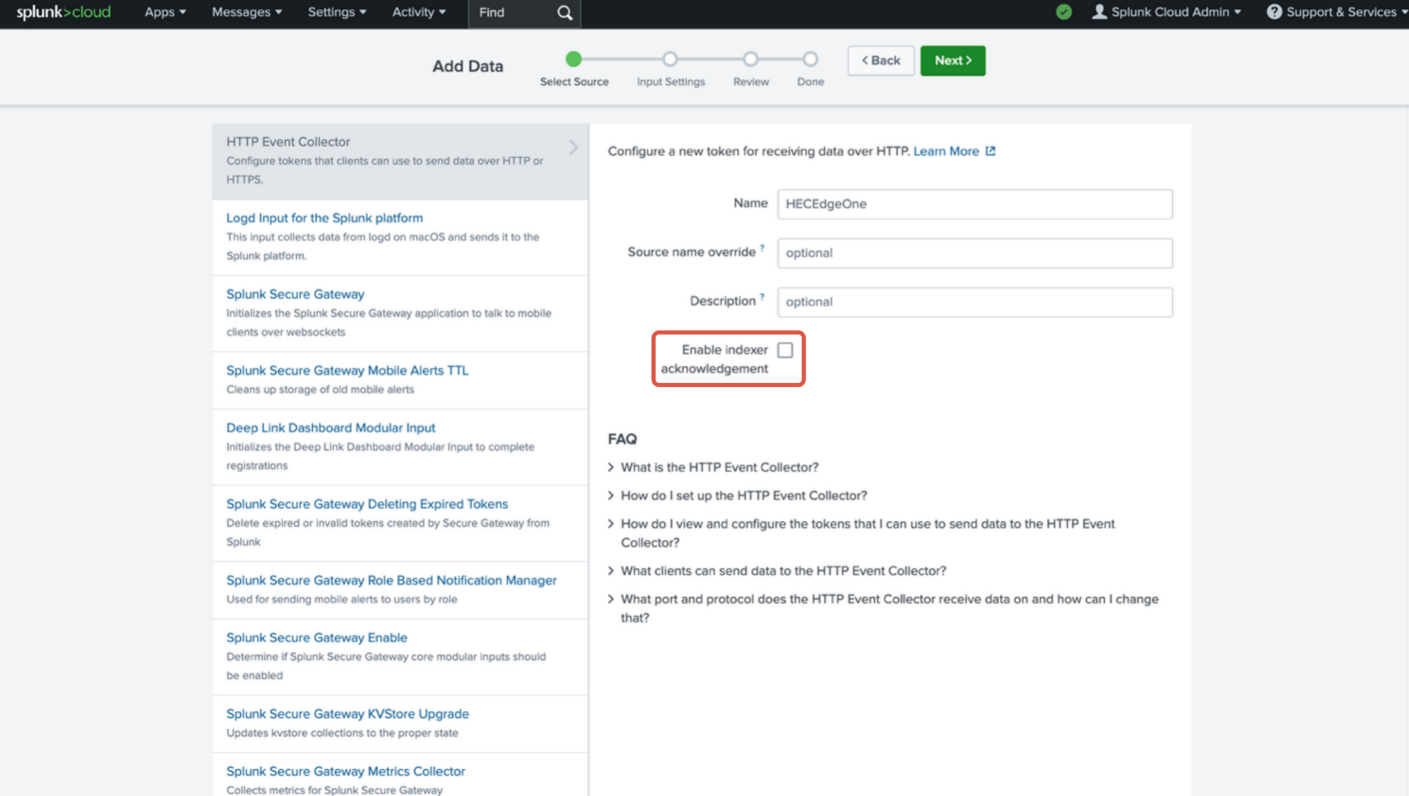 对于 Splunk Cloud,HEC 功能默认启用,可通过 Settings > Data Inputs > HTTP Event Collector 页面验证可用性。