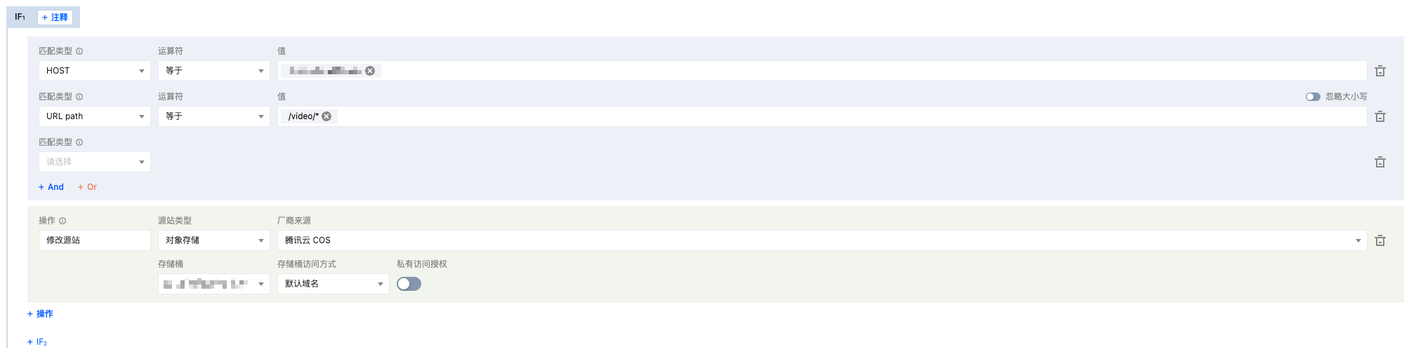 www.example.com,然后新增 And 匹配类型为 URL Path 等于 /video/*。5. 单击操作 > 选择框,在弹出的操作列表内,选择操作为修改源站,配置源站类型为对象存储,厂商来源为腾讯云 COS,选择对应的存储桶即可。