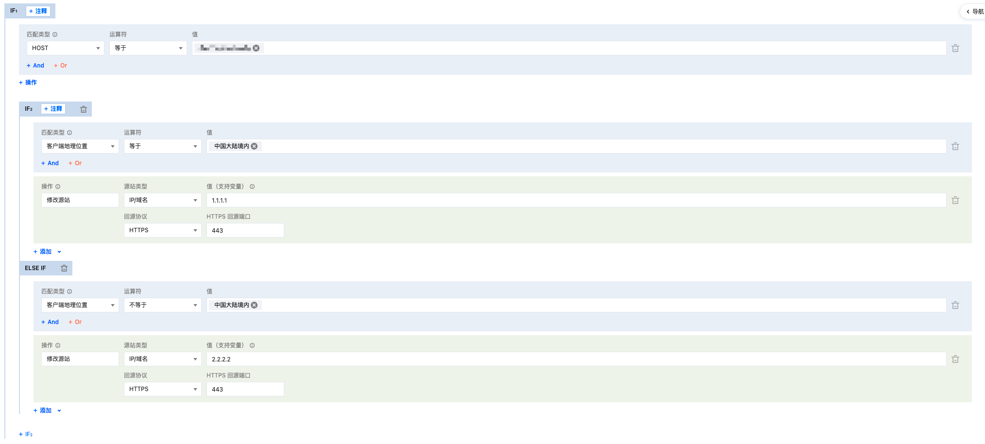 1.1.1.1;6. 单击添加,新增 ElSE IF 条件,匹配类型选择为客户端地理位置不等于中国大陆境内,操作选择为修改源站,配置源站类型为 IP/域名,指向