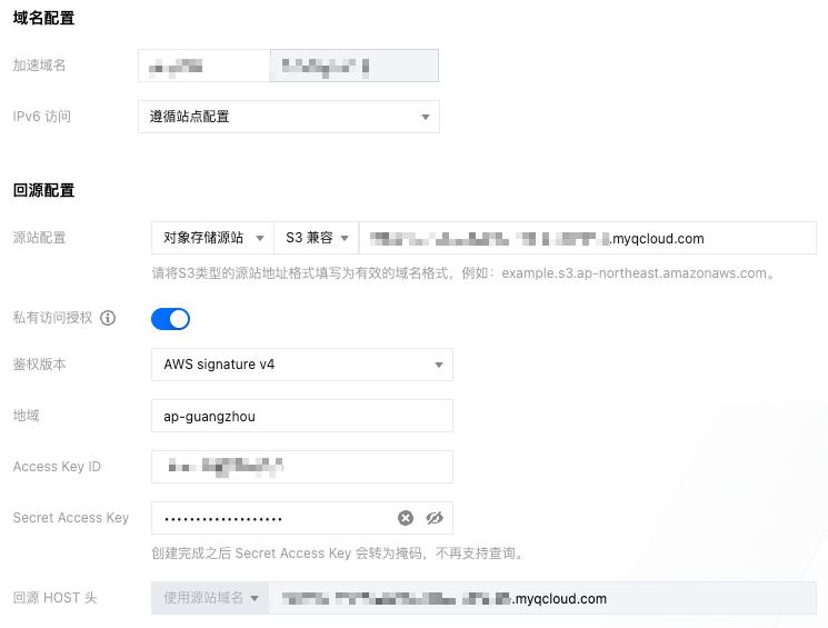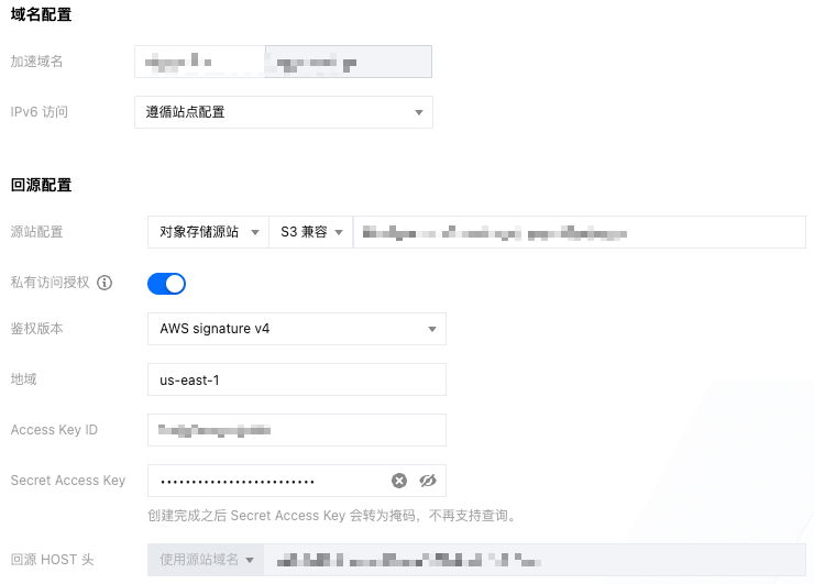 源站配置:选择为对象存储源站 > S3 兼容,选择输入您当前的需要配置的对象存储源站访问域名。