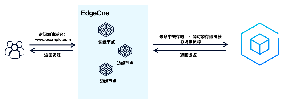 1. 结合 EdgeOne 覆盖全球可用区的边缘节点。当用户访问静态资源、图片、视频等数据时,EdgeOne 可将对象存储上的内容缓存到离用户最近的边缘节点。这样,用户无需每次都回源拉取资源,极大缩短了访问时延,提升了访问速度和体验。