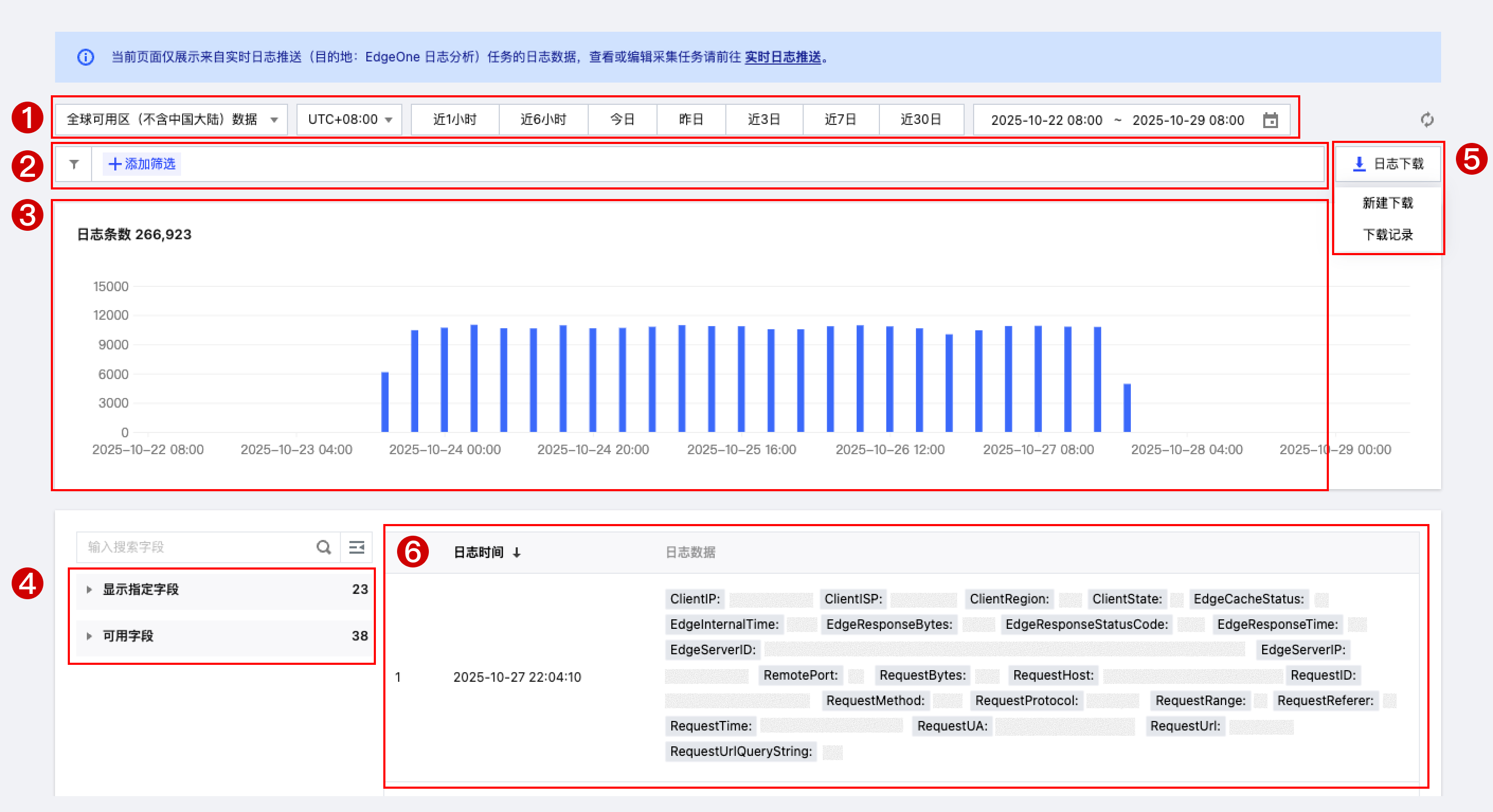 可用字段:展示当前七层访问日志支持的全部字段。若需新增推送字段,请前往「实时日志推送任务列表」修改已有任务。